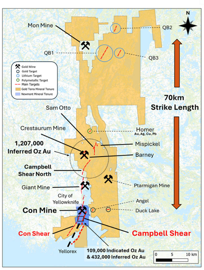 Gold Terra’s strategic land holdings covering an extensive mineralized system in the Yellowknife Gold Belt are shown in the figure below: