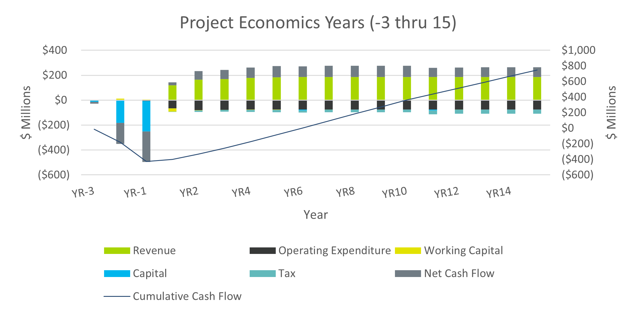 The expected initial project capital cost (inclusive of a gas COGEN facility) is US$367M for Phase 1 plus US$55M contingency (15%) and US$13M of owner’s cost