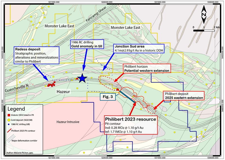 “In addition to the Hazeur property, the acquisition of the Monster Lake East and West properties gives us control over highly prospective ground along the Fancamp trend, adjacent to our Chevrier Project and IAMGOLD’s Monster Lake Project. We’re very encouraged by the strategic potential these new land packages offer. This acquisition extends our control to over 15 kilometres along the Guercheville Fault Zone ( see Figure 2 ), where the Philibert deposit remains open in both directions. The Hazeur property shows strong evidence for the continuation of Philibert-style mineralization. Additionally, we now cover more than 30 kilometres along the highly prospective Fancamp Fault Zone and Monster Lake trends, where we plan to apply our evolving geological and structural models to identify and advance new discovery targets,” added Adree DeLazzer, Vice President of Exploration.
