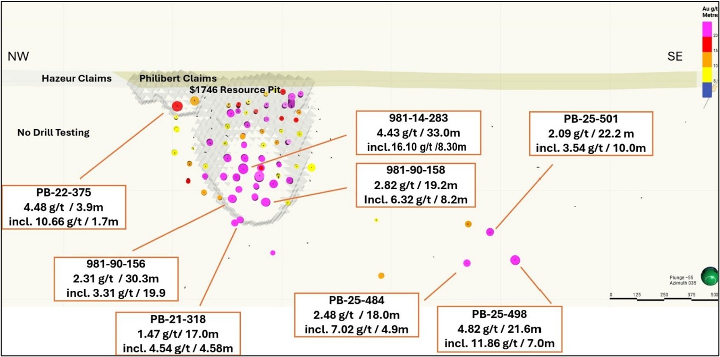The Company sees potential to expand the Philibert deposit along strike to the west, particularly within multiple shear zones such as the Red Fox Zone, which historically has seen the most drilling. The western limit of the Philibert deposit remains open, highlighted by near-surface intercepts of 4.84 g/t Au over 3.9 metres, including 16.4 g/t Au over 0.8 metres in hole PB-22-375. These results suggest the presence of a high-grade plunge within the gold system, which the Company is actively investigating ( see Figure 2 ).