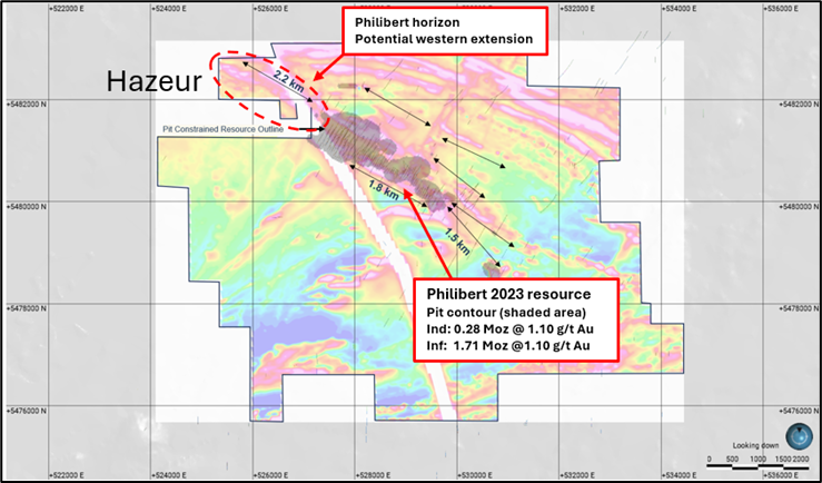 The recent acquisition of the Hazeur property, directly adjoining the northwest boundary of the Philibert Project, strengthens this expansion opportunity. Historical drilling on Hazeur returned anomalous gold values near the shared boundary, indicating the potential continuation of the Philibert mineralized system which is also supported by airborne geophysics and regional mapping.