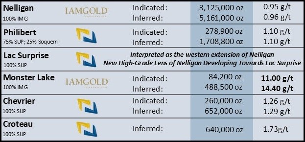 The Philibert Project is located 9 km from IAMGOLD Corporation’s Nelligan [2] Gold project. Philibert hosts a maiden 43-101 inferred resource of 48.5 Mt at 1.10 g/t Au for 1,708,800 ounces Au and an indicated resource of 7.9 Mt at 1.10 g/t Au for 278,900 ounces Au. [3] Northern Superior holds a majority stake of 75% in the Philibert Project, with the remaining 25% owned by SOQUEM, and retains an option to acquire the full 100% ownership of the project. Chevrier hosts an inferred mineral resource of 15.7 Mt at 1.29 g/t Au for 652,000 ounces Au (underground and open pit) and an indicated mineral resource of 6.4 Mt at 1.26 g/t Au for 260,000 ounces Au. [4] Croteau hosts an inferred mineral resource of 11.6 Mt at 1.7 g/t Au for 640,000 ounces Au. [5] Lac Surprise hosts the Falcon Zone Discovery, interpreted to be the western strike extension of IAMGOLD Corporation’s Nelligan Gold project.