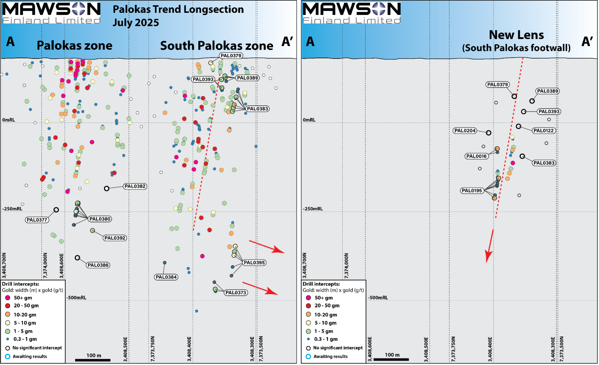 80 m strike-extension of South Palokas (South Palokas Deeps), and a 46 m down-plunge step-out at New Lens, located in the footwall-zone of the South Palokas mineralised system. Significant intercepts include: